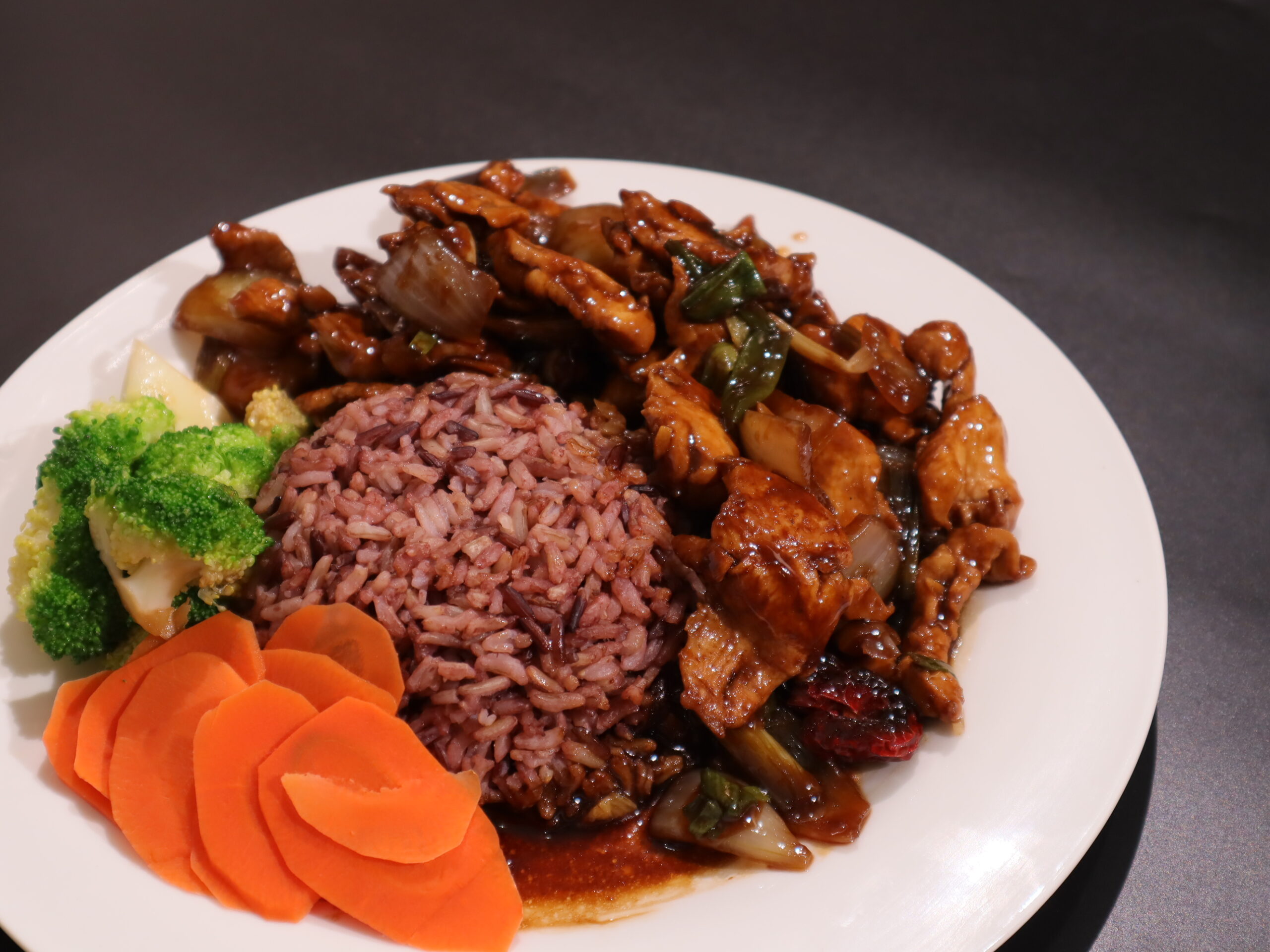 Chicken breast, Black & brown rice, Broccoli, Carrot, Onion, Spring onion, Dried chili, Ginger, Garlic, Homemade Kung Pao Sauce (Light soy sauce [No MSG], Oyster sauce [No MSG], Dark soy sauce [No MSG], Vinegar, Erythritol & Stevia natural sweetener, Tapioca starch)